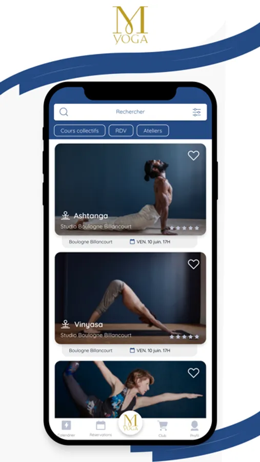 Téléchargez l’appli M-Yoga, studio de yoga à Boulogne-Billancourt, pour accéder au planning, réserver vos cours, vos formations certifiées, vos retraites, vos massages, et visualiser vos cartes et les promotions du moment.
