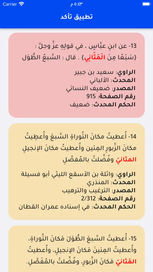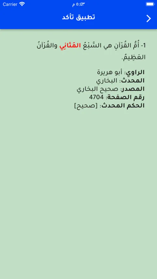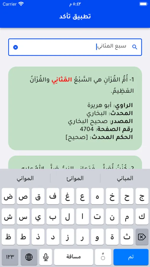 يمكن للمستخدمين البحث عن الأحاديث النبوية بسهولة باستخدام الكلمات الرئيسية، ومن ثم يقوم التطبيق بعرض الحديث بشكل مفصل، بما في ذلك سند الحديث ورواته، ويعرض أيضًا تقييم الحديث بناءً على درجة صحته، وذلك باستخدام نظام تقييم شامل يشمل الدرجات المختلفة من الصحيح والحسن والضعيف والموضوع.