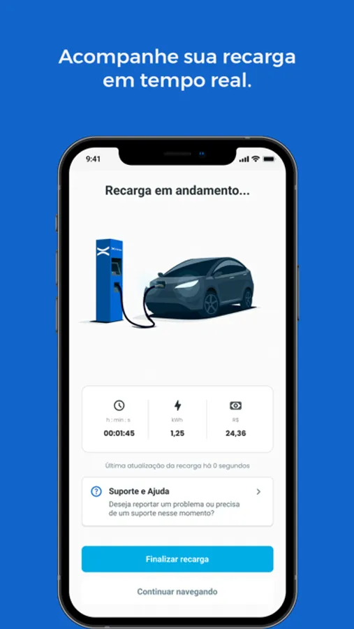 Acompanhe o histórico de carregamento do seu veículo, verificando a quantidade de energia consumida, a duração da recarga e os custos associados, para ter maior controle dos seus gastos.