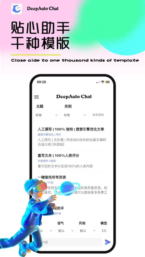 Welcome to "DeepAuto Chat," an AI chat application based on AI Model Our intelligent chat assistant provides you with an enhanced conversational experience. Whether you need life advice, assistance with studying, or simply want to have a relaxed and enjoyable conversation, our AI chat assistant is here to offer personalized suggestions and answers tailored to your needs. Furthermore, the application contains a vast collection of templates spanning various industries, allowing for greater imagination and creative inspiration. Join us now and embark on an unprecedented era of intelligent chat!