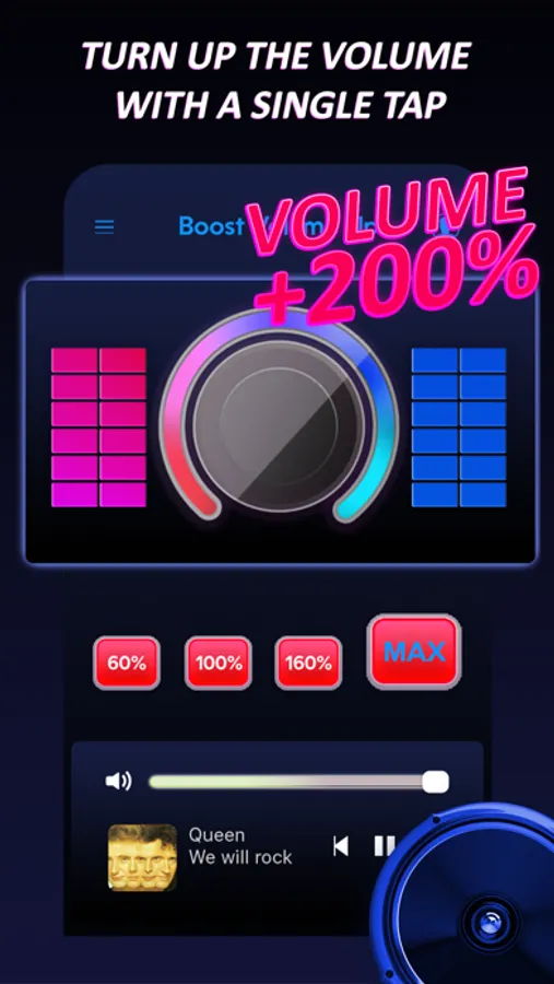 Boost Volume Up is a mobile application that increases the volume level of the device beyond the default settings. The app works by amplifying the audio signal, which can be useful for people who have difficulty hearing or for use in loud environments. The app typically has a user-friendly interface, with a volume slider or buttons that allow the user to easily adjust the volume level.