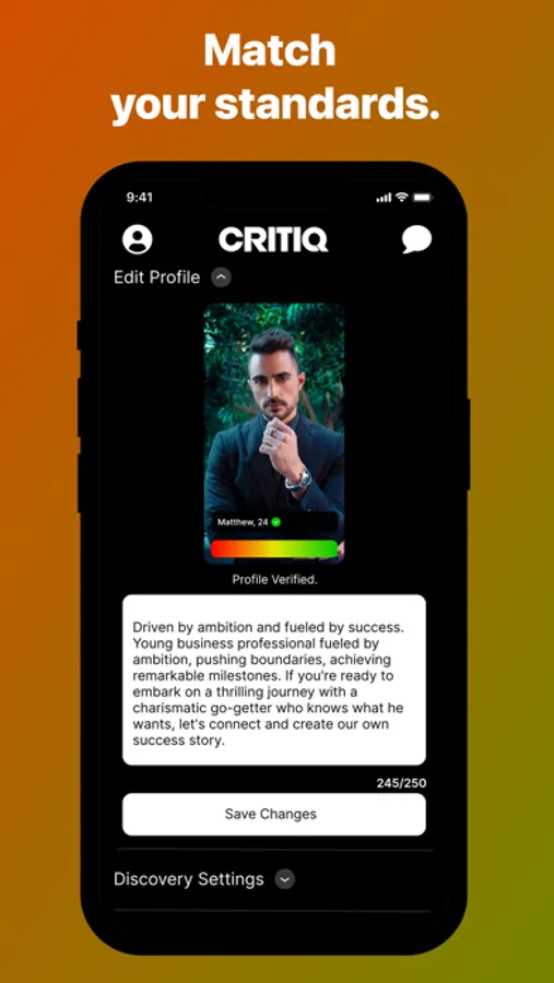 CRITIQ isn't just another dating app. It's a revolutionary platform that empowers you to quantify your feelings and desires using our unique matching system. We believe dating should be fun, which is why our system is designed to be intuitive and seamless, eliminating long profile creation processes and awkward prompts.
