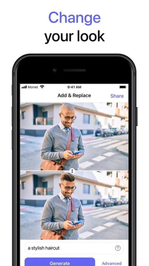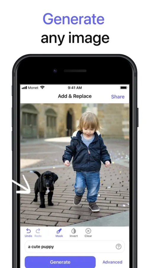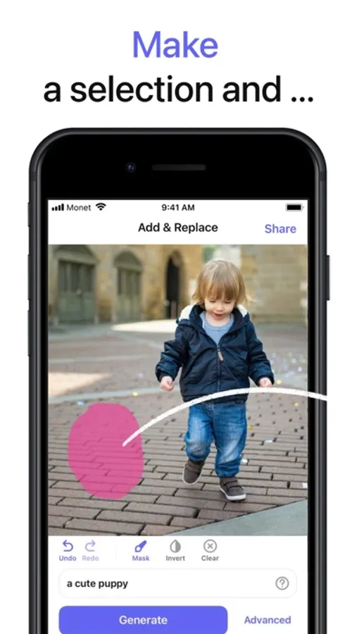 Take your photo, mark the area where you want to add a new object or replace an existing one, type in description of what should appear in that place, tap Generate and check out the result. You may want to fine tune generation with Advanced settings, like “Image strength” or “Negative prompt”. Easily undo undesired changes of your photo. Tap Apply to save your work and continue later.