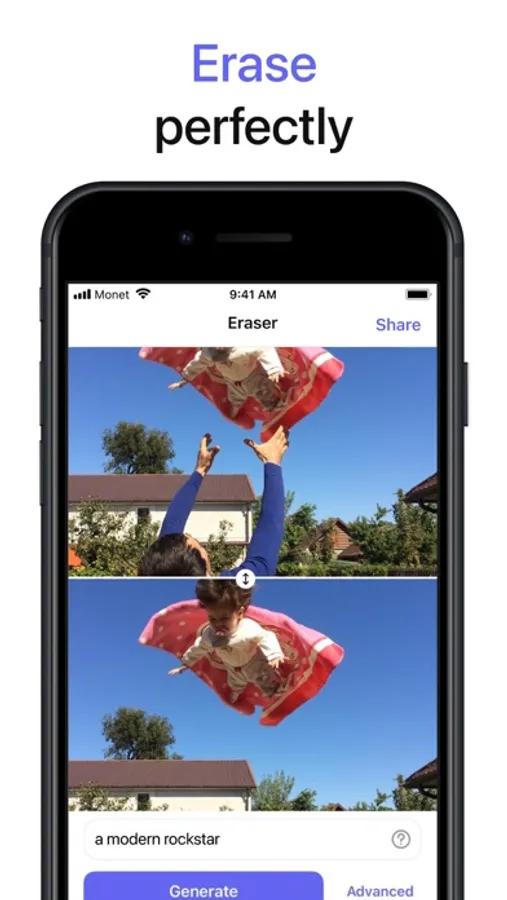 Take your photo, mark the area you want to be filled with background and tap Erase. Monet’s AI is able to remove objects like they never exist on the photo! You may want to check different edits by tapping Erase several times. Tap Apply to save your current work.