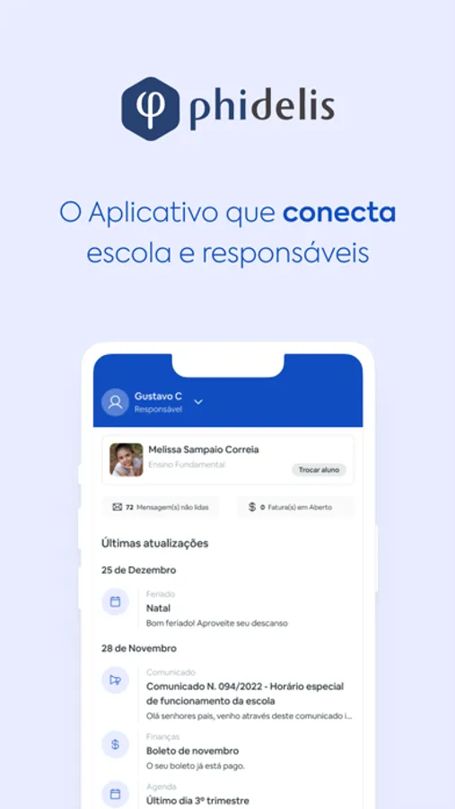 Tenha todas as funcionalidades do Phidelis na palma da mão. Acompanhe os comunicados, notas de boletim, extrato finaneiro e muito mais!