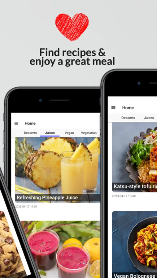 Whether you're looking for healthy and vegan breakfast, lunch, dinner, or snacks, our app has you covered. Many healthier alternatives like veggies and fish, our recipes are sure to satisfy your cravings.