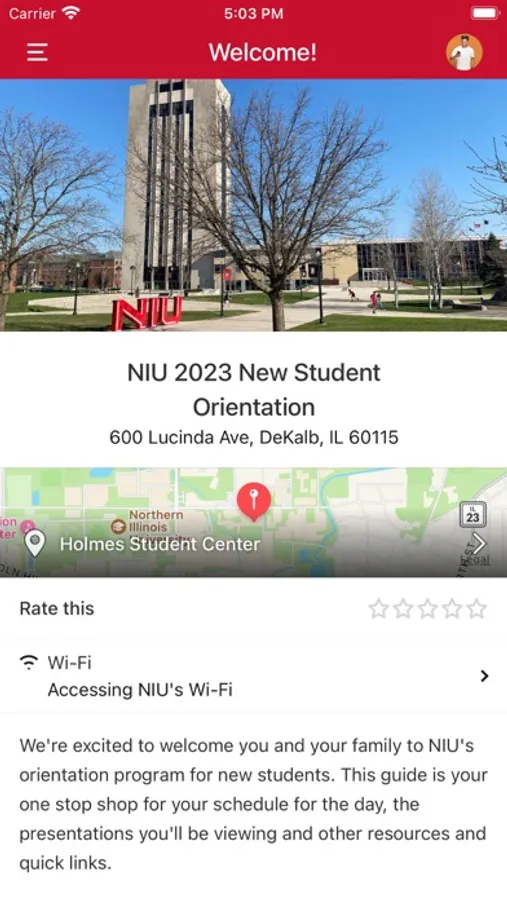 The NIU Guidebook app helps first-year students and families navigate their orientation program and Week of Welcome (WOW). You'll find the latest schedule of events, presentations and more!