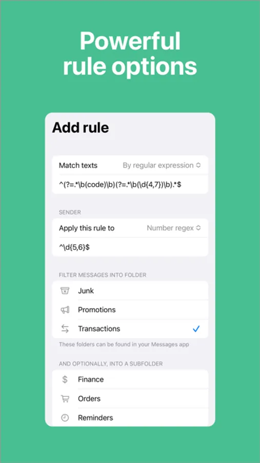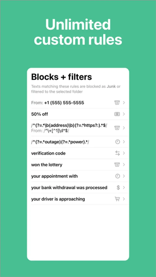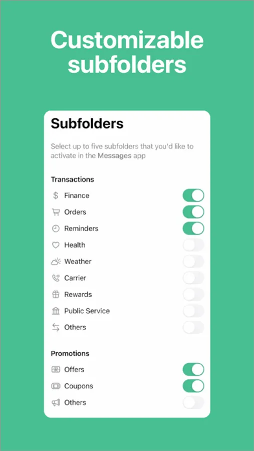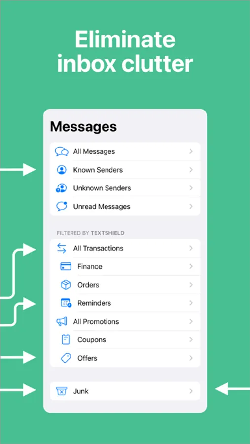 Can't find your real messages between the reminders, codes, and updates? TextShield efficiently organizes your inbox so that important messages stand out. We support filtering into Transactions, Promotions folders, as well as any of 12 subfolders such as Reminders, Orders, Coupons, etc.