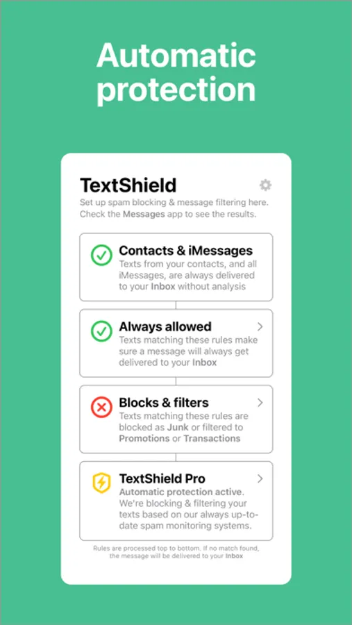 Put spam blocking and text sorting on auto-pilot with our auto-updating smart rules and proactive threat detection. Available for $3.99 per month or $29.99 per year, both with a 7-day free trial. These subscriptions provide access to all TextShield features and services.