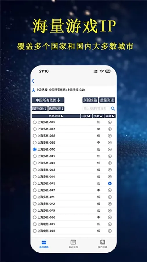 领航加速器是一款游戏加速工具软件,采用全网节点覆盖、动态智能路由、流量监控、数据中转、加密通道等最新的网络IP技术为广大网游玩家提供网游加速和登录服务,能有效解决网游卡机、掉线、延时高、登录难等问题;APP支持智能选线、手动自由切换线路、批量测速、线路搜索、异常断开禁网等功能。线路覆盖全球多个国家和国内大多数城市,提供千万优质静态和动态游戏IP服务,支持手机、电脑、平板、模拟器、软路由使用,网游加速,领航业界。