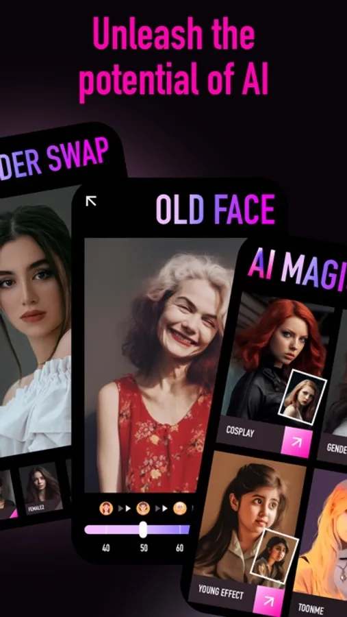 Whether you want to see what you'll look like in 50 years or simply want to experiment with different looks, our AI face filters have got you covered.