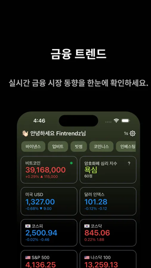 ● Fintrendz는 비트코인 실시간 가격, 암호화폐 심리지수, 원달러 환율, 달러 인덱스, 코스피, 코스닥, S&P 500, 나스닥 100, 다우존스, 닛케이 225, 국제금 시세, 국제은 시세, WTI유, 브렌트유, 천연가스 가격, 난방유 가격 등 다양한 금융 정보를 제공합니다.