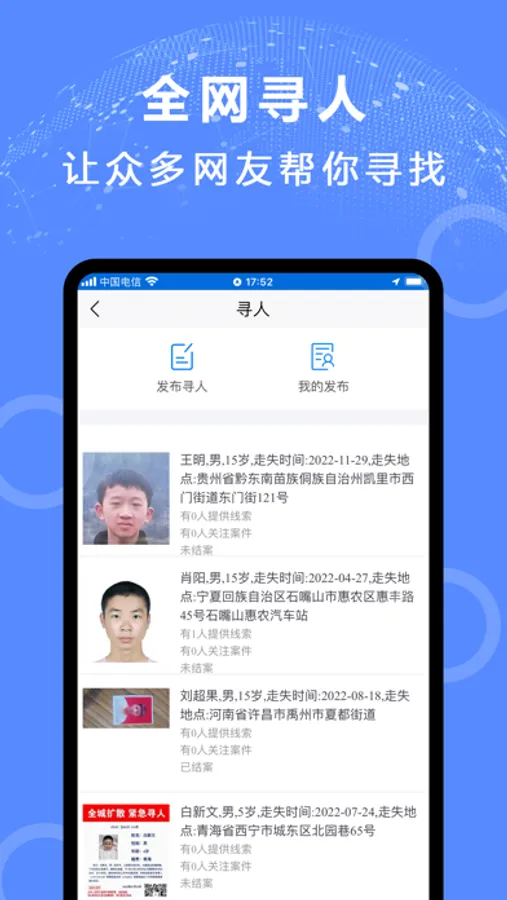 发布寻人: 免费发布寻人信息,千万网友提供线索,科技助力寻人。