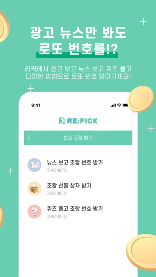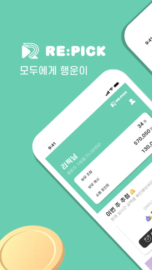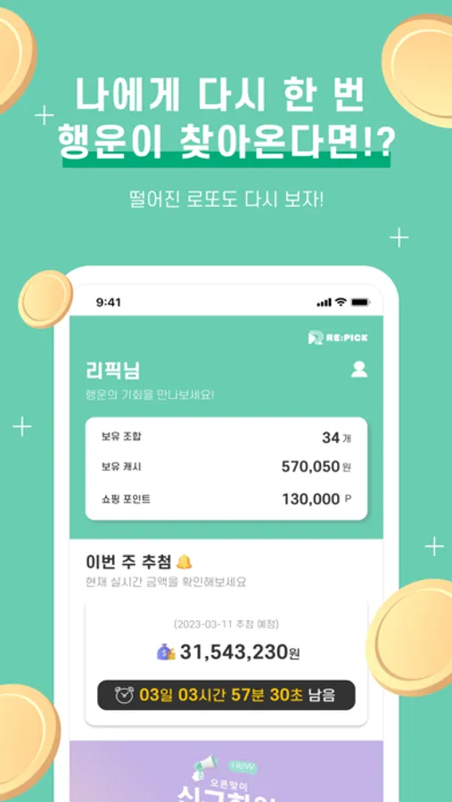 리픽은 매주 떨어져서 버려지는 로또에 재 당첨의 기회를 제공하는 신개념 앱테크 어플입니다.