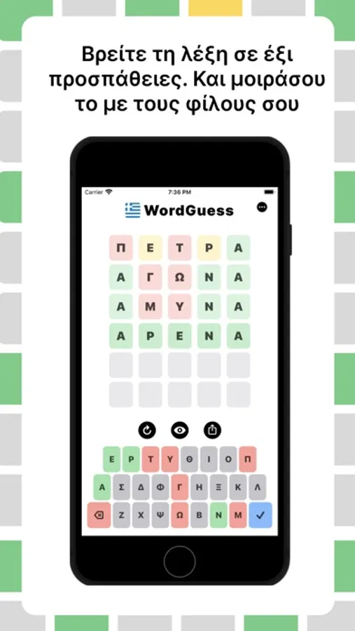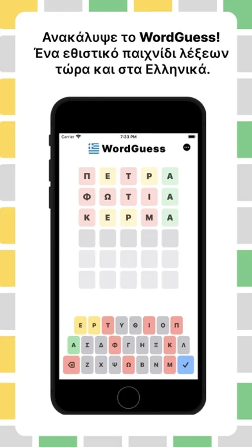 Το WordGuess είναι ένα εθιστικό παιχνίδι λέξεων που θα σας καθηλώσει! Στην ελληνική έκδοση αυτού του δημοφιλούς παιχνιδιού, ο στόχος σας είναι να βρείτε τη λέξη σε έξι προσπάθειες. Με κάθε προσπάθεια, θα λαμβάνετε υποδείξεις για τη θέση και την ορθότητα των γραμμάτων. Αναπτύξτε τις δεξιότητές σαςκαι διασκεδάστε ενώ εμβαθύνετε τις γνώσεις σας στην ελληνική γλώσσα! Κατεβάστε το WordGuess τώρα και απολαύστε ατελείωτες ώρες παιχνιδιού.
