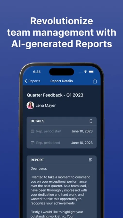Here's how it works: As a team lead or manager, you input individual feedback about your employees into the app. Our tool then leverages OpenAI®'s GPT technology to process your inputs and craft detailed performance reports. It highlights both the positive aspects and areas of improvement for each of your team members, thus making the feedback process more streamlined and efficient.