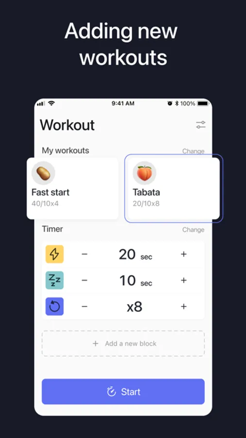 Add new workouts and save all settings using emojis and names of your choice. This will help you to start training quickly and not get confused in the settings.