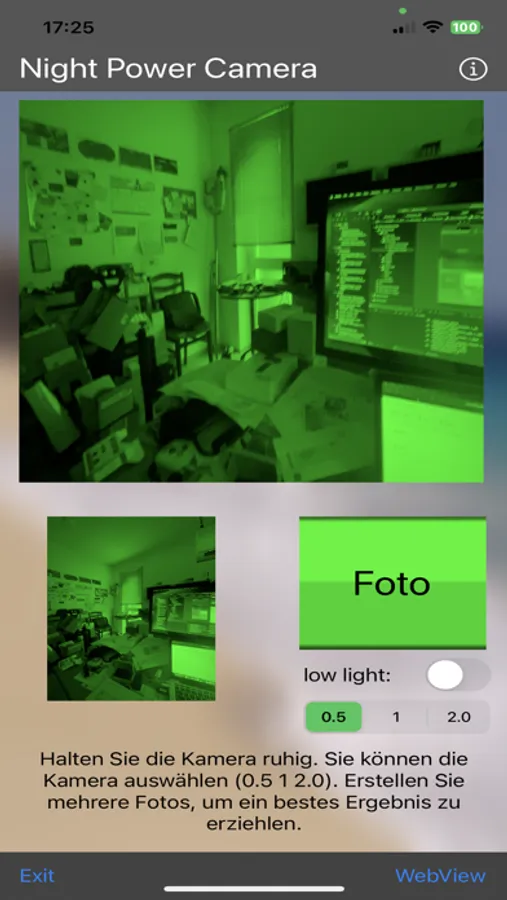 Take photos in the dark or in low light. The preview and the result is a green image, like a real night vision device. The image is saved in Photo Album and has a resolution of 3384x4512, 15 MP, in portrait or landscape orientation depending on how you orient the iPhone. With a switch you can further increase the brightness, contrast and saturation and achieve optimal results. You can choose the camera, 0.5, 1, 2.0, so ultra wide angle, wide angle and telephoto. It works on iPhone with 2 or 3 cameras (Pro model).