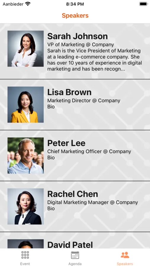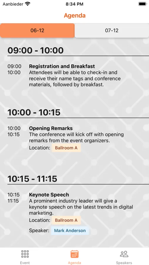 Download the EventApper app to gain access to your event. With the EventApper app you will be able to view all information about your event, with things such as up-to-date agendas, list of speakers, locations, addresses. Also you will be able to choose optional workshops or pass along your preferences.