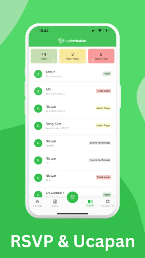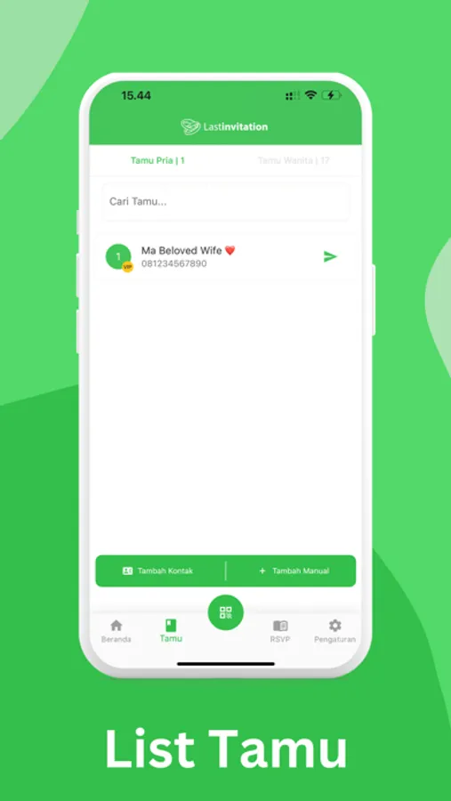 2. List Tamu: Fitur ini memungkinkan pengguna untuk membuat daftar tamu dan mengundang mereka ke acara. Setiap tamu akan memiliki informasi yang terkait dengan acara seperti waktu dan lokasi, serta status undangan.