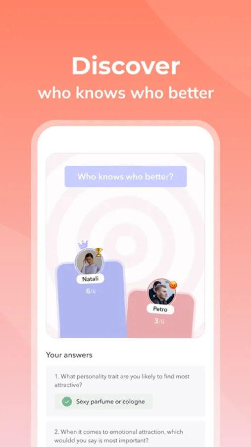 - engage in fun daily couple questions for a closer connection. Discover your partner's response only after both of you have answered!