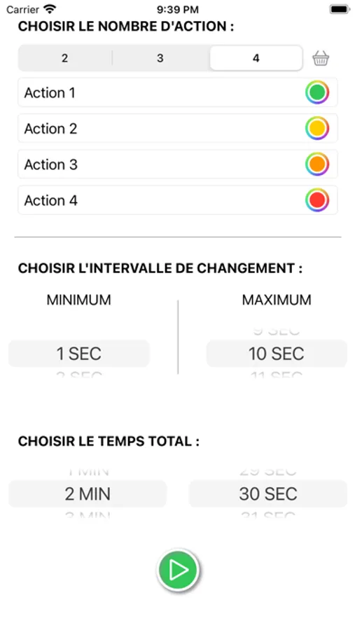 L’application offre la possibilité de choisir l’intervalle de temps du changement. En d’autre terme, le changement se fait de façon aléatoire parmi vos critères. Vous pouvez donc choisir le temps minimum pour qu’un changement s’effectue et le temps maximum. ASTUCE : Si vous voulez un changement après un temps bien déterminé, vous pouvez régler le temps minium et maximum sur la même durée.