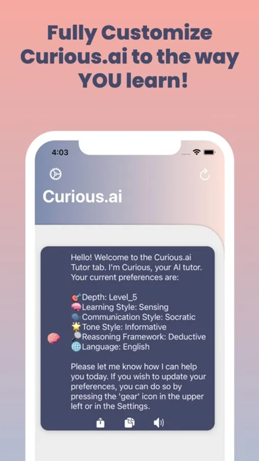 Get help with solving complex problems or writing that next paper using Curious your customizable AI chat. Create the perfect tutor for how you like to learn! From Socratic, Story Telling, or Humorous, customize Curious.ai however you like. Here are some of ways you customize your study companion.