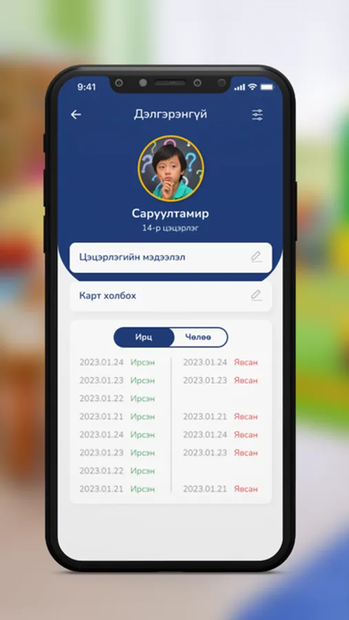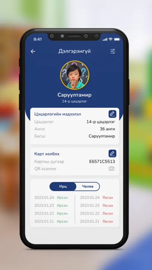 Энэхүү апп нь асран хамгаалагчид цэцэрлэгт хамрагдаж буй хүүхдийн ирж, явах ирцийг бүртгэх зорилготой аппликейшн юм. Тус аппликейшнээр хүүхдийн ирц бүртгүүлэхээс гадна өвчний болон бусад чөлөө авах хүсэлтийг цэцэрлэгт илгээх боломжтой