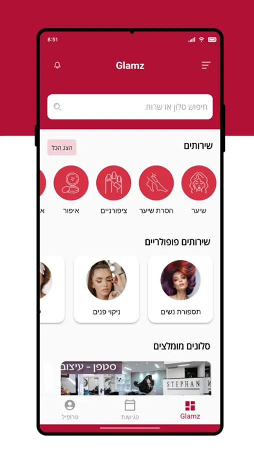 הורידו עוד היום את GLAMZ והתחילו ליהנות ממקבץ אנשי המקצוע המובילים ביותר בתחומי הביוטי והטיפוח בישראל. הטוטאל לוק שמגיע לכם עוד רגע בהישג ידיכם! מציפורניים מטופחות, שיער קורן וזוהר, ועד עור חלק ונטול פגמים ואיפור משגע, המקצוענים ומקצועניות של GLAMZ מחכים לגרום לכם להיראות ולהרגיש הכי טוב שרק אפשר.