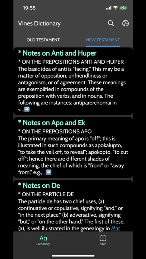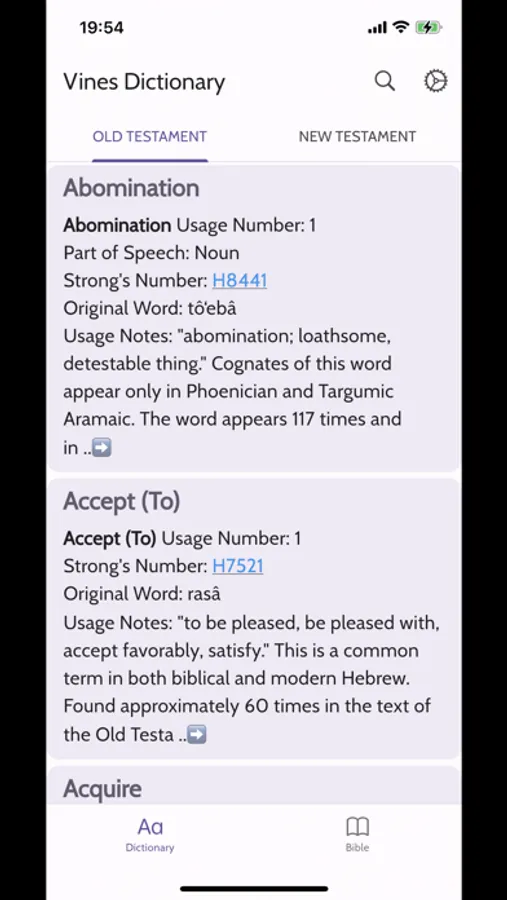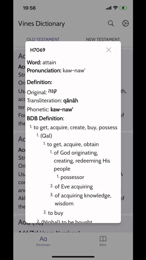 This application contains the classic Vines dictionary from Old and New Testament. It includes words from the whole Bible. The entries in both OT and NT dictionaries are organized alphabetically in English, along with the Hebrew or Greek words from which they are translated. This dictionary providers insights into the various shades of meaning, plus related Scripture references are included.