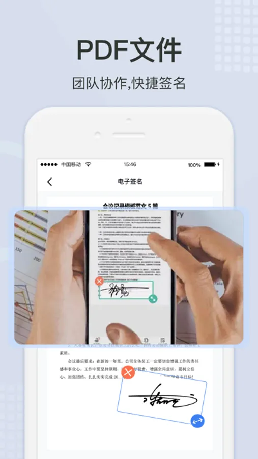 将您在纸上的签名,复制PDF文件相应位置,并可保存使用,含有签名的PDF文件只会存在您的手机本地.