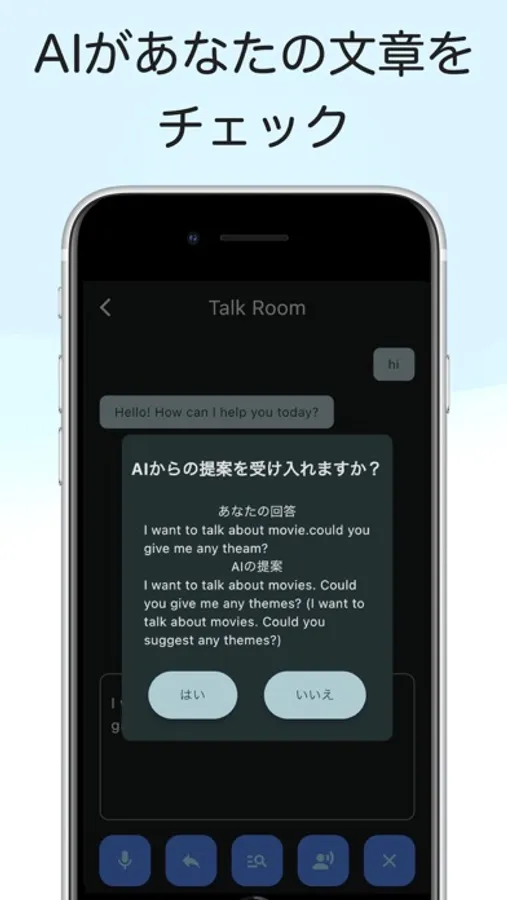 あなたの英文をAIがチェックし、正しい英文を提案します。提案された英文をそのまま反映し、AIへ会話を送信することができるので効率的に英会話を進めることが可能です。