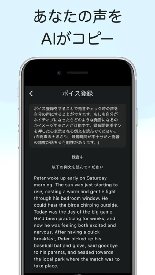 ユーザーの声を事前登録することで、発音チェック時にAIがあなたの声で文章を読み上げます。自分がネイティブスピーカになったことをイメージしながら学習することが可能です。