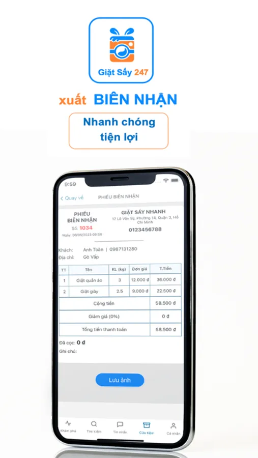 Với Ứng dụng Giặt Sấy 247, Bạn có thể quản lý cửa tiệm của mình một cách dễ dàng. Tính năng Lên Đơn giúp cho việc tạo đơn giặt sấy, giặt ủi và giặt là trở nên nhanh chóng và thuận tiện. Đơn hàng sau khi tạo xong sẽ được xuất ra Biên Nhận đơn hàng, và có thể gửi biên nhận thông qua Zalo, Facebook và các ứng dụng khác.