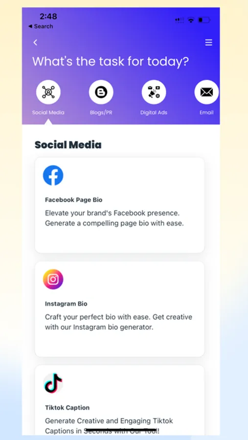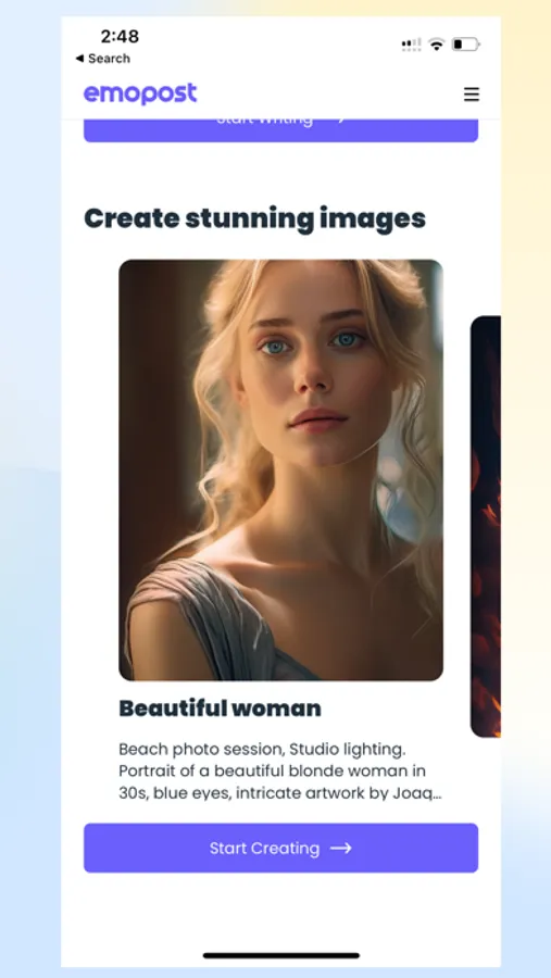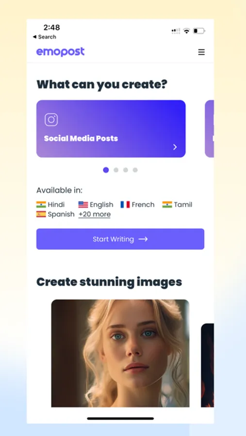 Looking to level up your social media game? Emopost has got you covered! Our app is the perfect solution for all your marketing needs. With Emopost, you can effortlessly generate eye-catching photos and captivating captions for platforms such as Instagram, Tiktok, Facebook, Pinterest, and blogs, among others.