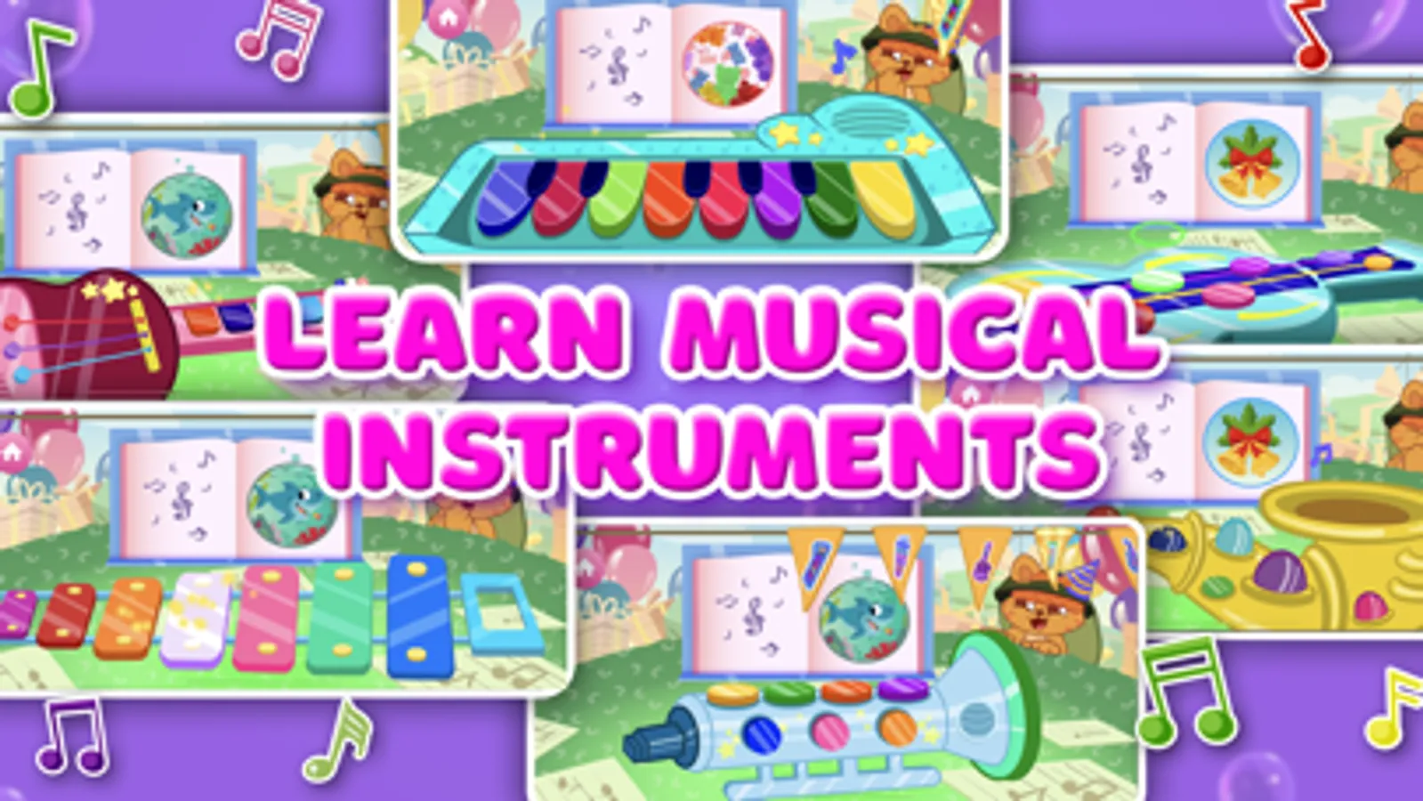 - Explore a variety of musical instruments, including piano, xylophone, trumpet, flute, violin, guitar, drums, saxophone, and accordion.