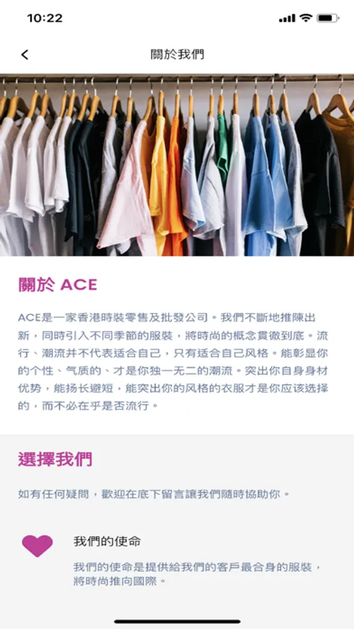 ACE是一家香港時裝零售及批發公司。我們不斷地推陳出新,同時引入不同季節的服裝,將時尚的概念貫徹到底。