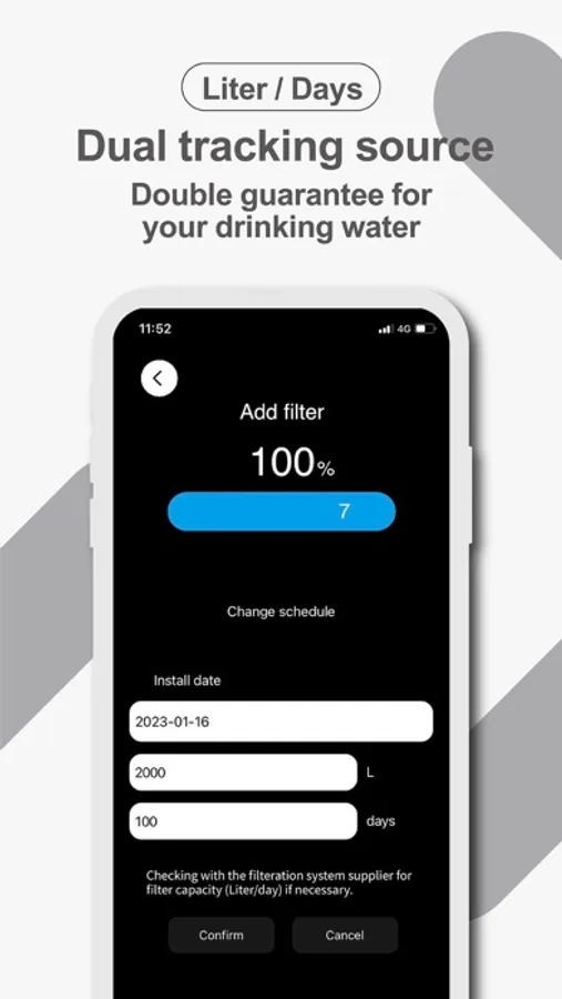 Provide two source tracking. Filter’s liter capacity and filter’s days capacity.