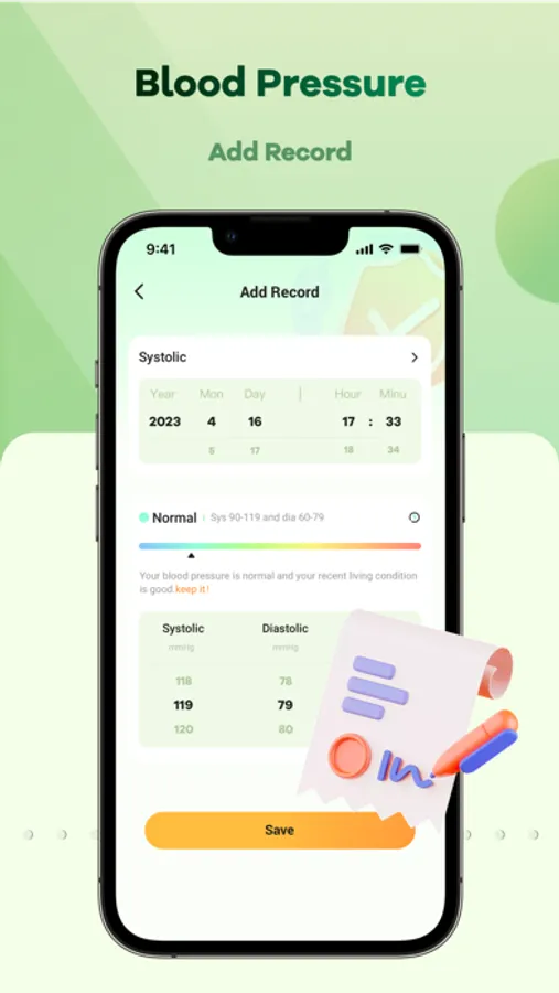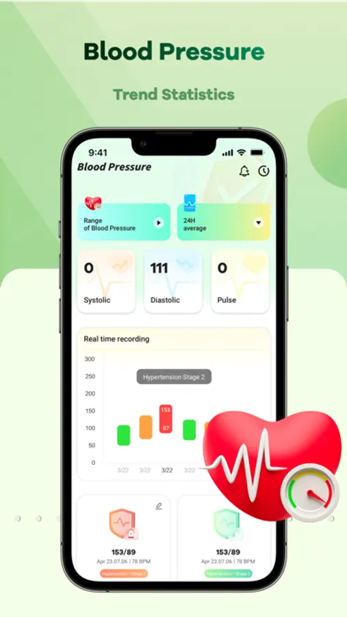 Blood Pressure Log: The app allows users to regularly log their blood pressure readings, including systolic and diastolic readings, date and time of measurement. Users can easily enter data using a simple and intuitive interface, and the app stores the data for future reference.