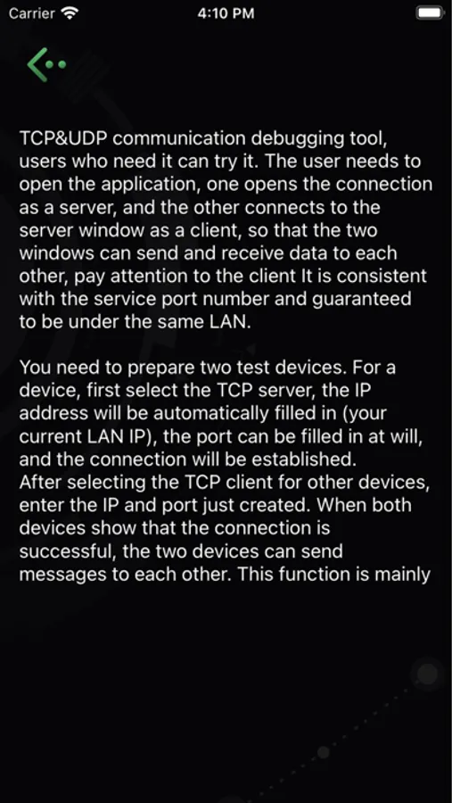 TCP&UDP communication debugging tool, users who need it can try it. The user needs to open the application, one opens the connection as a server, and the other connects to the server window as a client, so that the two windows can send and receive data to each other, pay attention to the client It is consistent with the service port number and guaranteed to be under the same LAN.