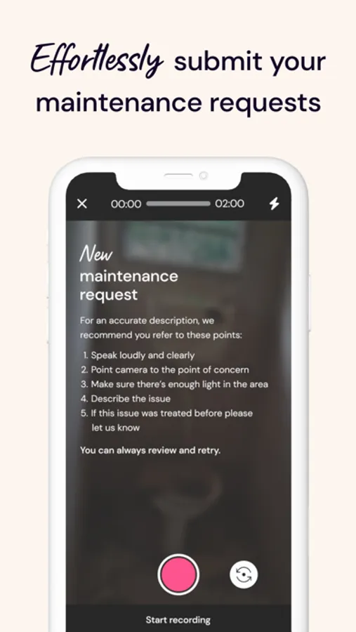 Prompt repairs: For any problem, simply record a video to explain the maintenance issue, once we approve your request you will be able to directly schedule with a service professional, all within the app. The service professional will show up on your doorstep with all the materials and equipment they need in order to do the required maintenance.