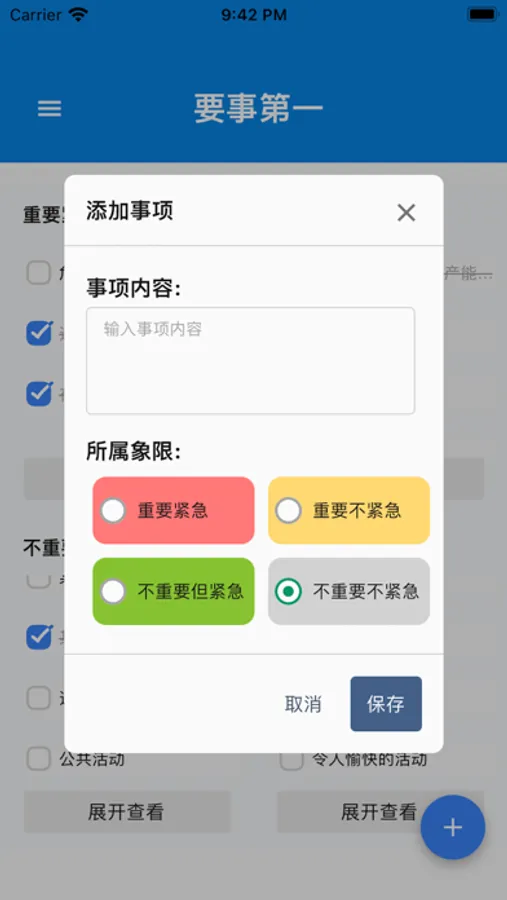 本应用是一个简单的要事四象限管理工具,帮助你更好地管理你的时间。