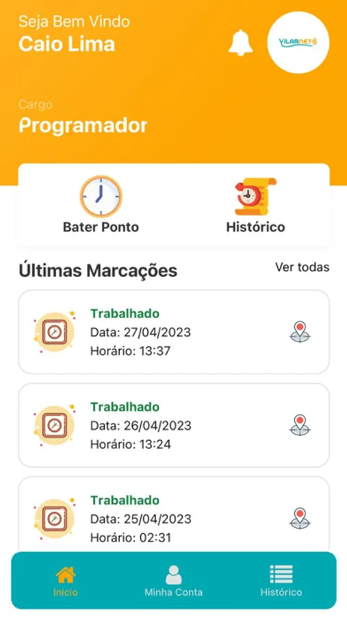 Aplicativo de Ponto Eletrônico da empresa VilarNet