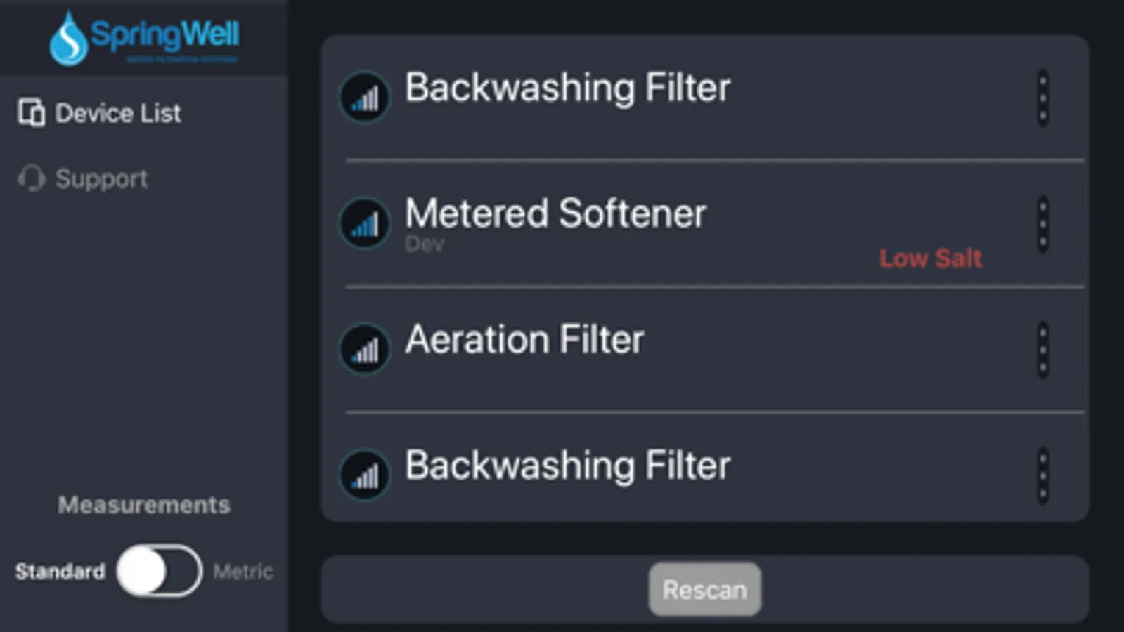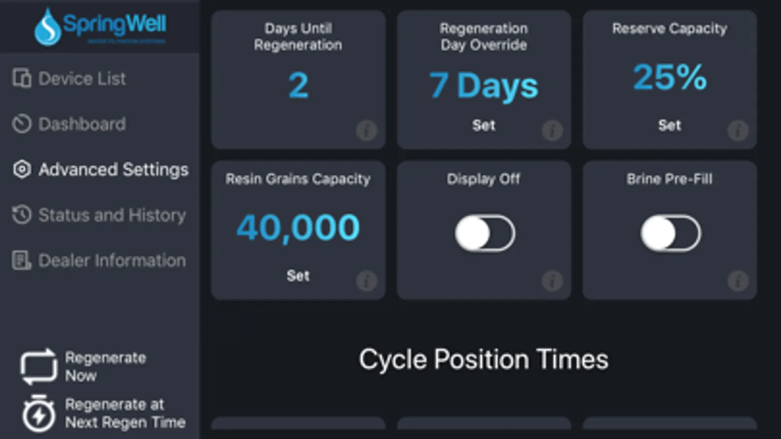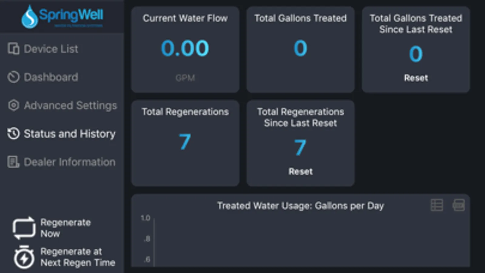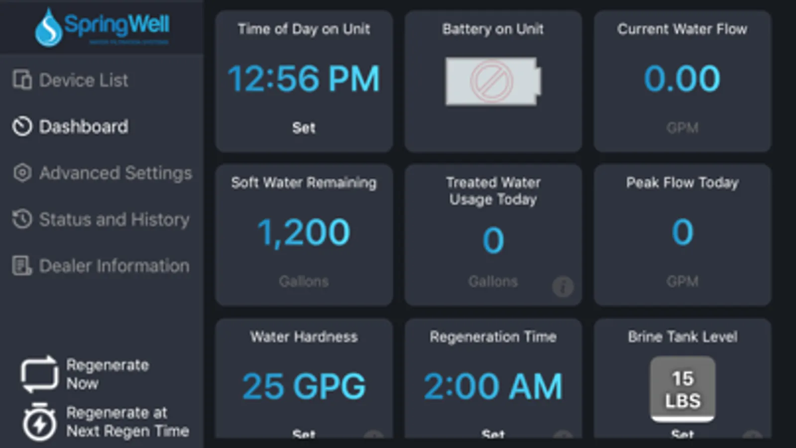 SpringWell Water Smart App makes setting up and monitoring your water treatment system easier than ever! When used with a SpringWell Water Filtration Systems valve, the user, through the app, can do the following functions: