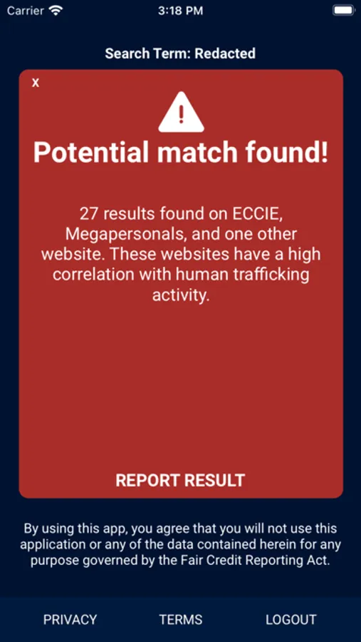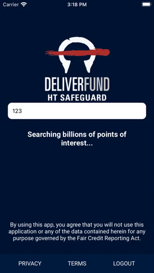 The Human Trafficking Safeguard app provides users an easy way to search for an email address or phone number and see if there is a match to DeliverFund's human trafficking data. DeliverFund owns one of the largest and cleanest databases of human trafficking information in existence.