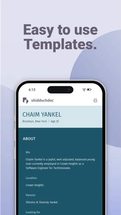 This app has revolutionized the shidduch resume. It’s no longer necessary to make static word/google documents and format it yourself, then every time you change something you have to resend your resume to everyone you know. There is also no need to worry that someone has an old resume that has outdated information. With this model you send the link and when you update and change your resume it’s automatically changed for anyone with the link and the they have a bunch of really nice templates. I would definitely recommend it to anyone who wants an easier, more streamlined experience with their shidduch resume