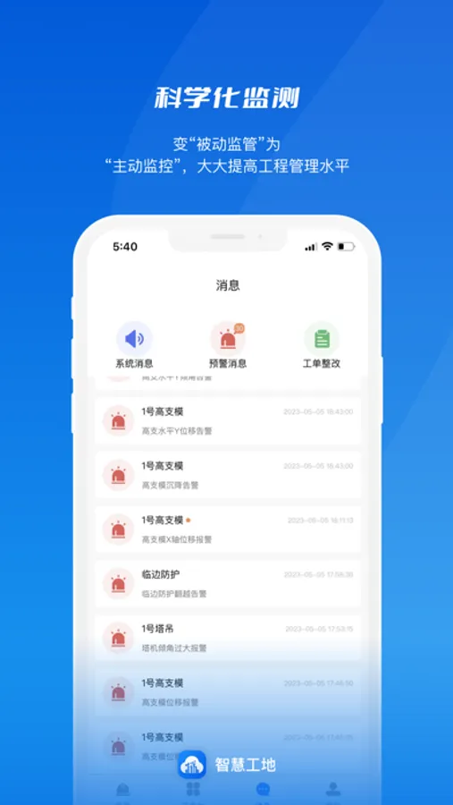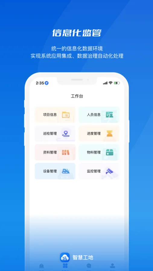 解决现存建筑工地施工环节中,管理成本居高不下、信息碎片化、各专业协同难等问题,面向住建厅、住建局等建筑监管部门或建筑集团、建筑公司等施工单位提供信息化监管、智能化监测、科学化监察、节约化运营的管理系统。