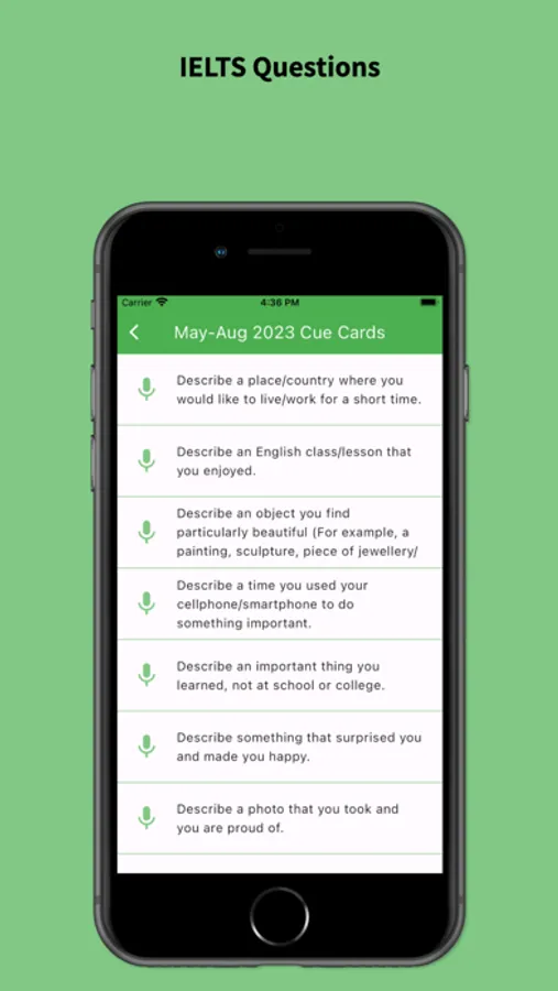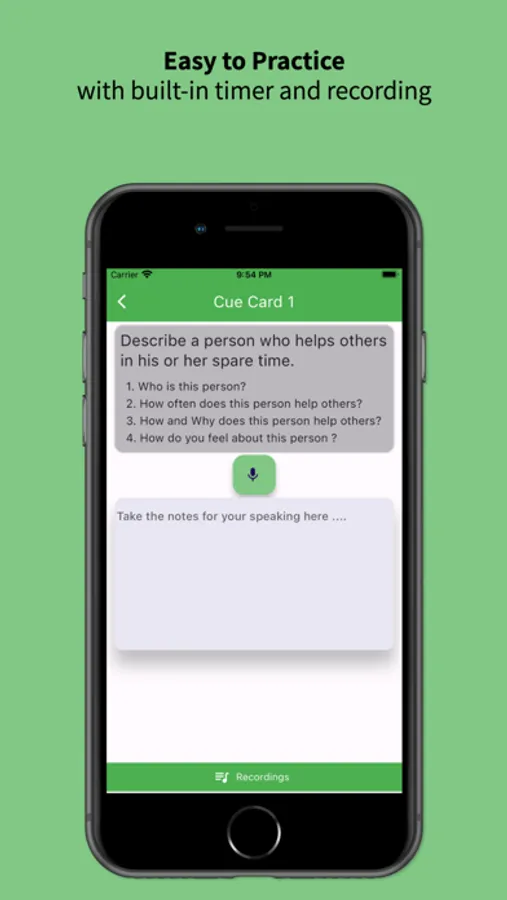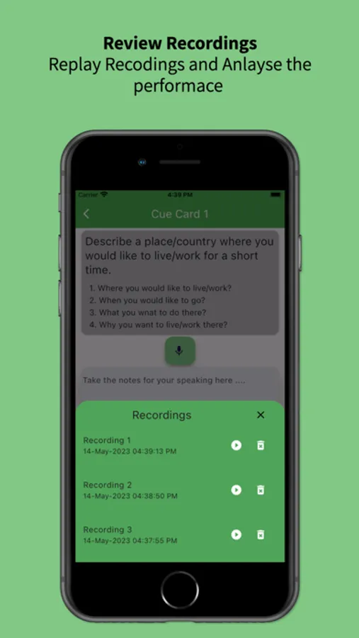 Basically, The application provides mock samples to practice for the IELTS and CELPIP Speaking modules where test-takers can practice along with recording their audio on the device and playback to listen and analyze how they did.