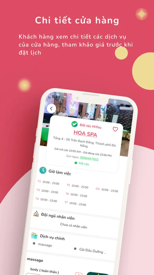 HiYou là ứng dụng mà người dùng có thể sử dụng để đặt lịch về lĩnh vực làm đẹp với các Spa, Salon hay Nail một cách nhanh chóng & tiện lợi. Bạn có thể xem được chi tiết về thông tin các dịch vụ hay giá cả có tại các cửa hàng để đưa ra quyết định về việc đặt lịch hẹn của mình.