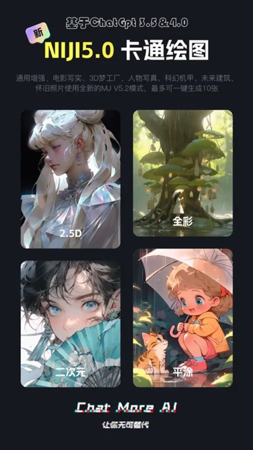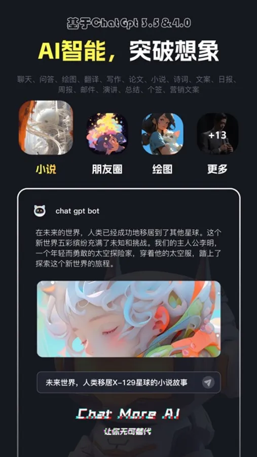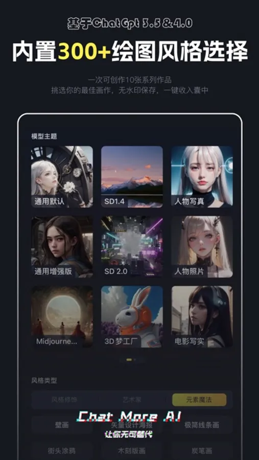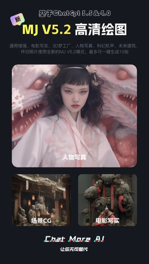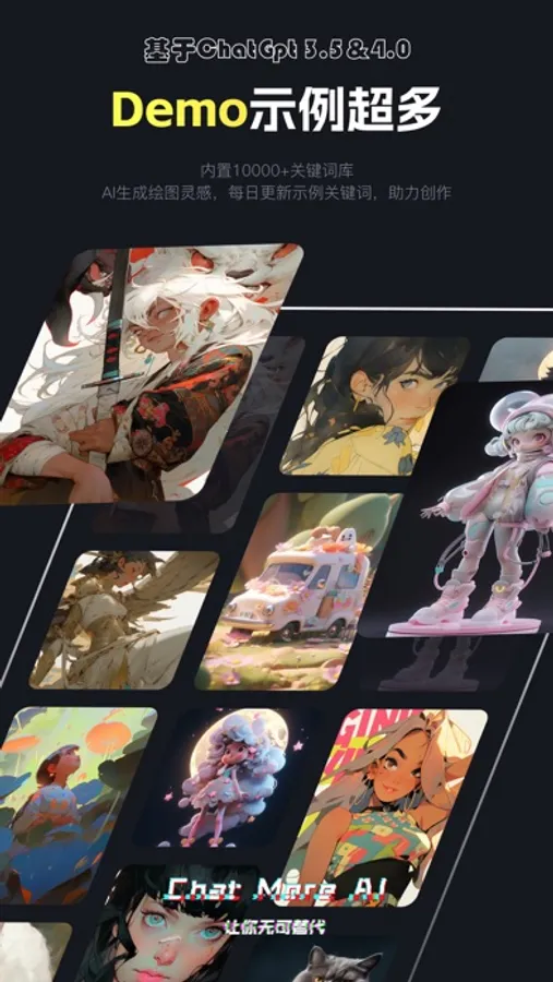 ChatMore Al是一款最先进前沿的人工智能机器人,它可以跟您对话,解答您的问题,帮您创作,绘图,代替您的部分工作,并具有自主学习能力,可以满足您工作中或生活中的各种问题。随时随地提供贴心服务,根据您的需求,高效且准确地回答您的各种问题并撰写任何类型的文章,让您的大脑得到释放,缓解词穷压力,提高生产效率,同时还可帮您短时间内生成大量高清精美的绘图,为您生成各种画面风格特色主题的艺术创作,轻松将您的想象力传递到图片上,解放您的双手,帮您完成设计工作。